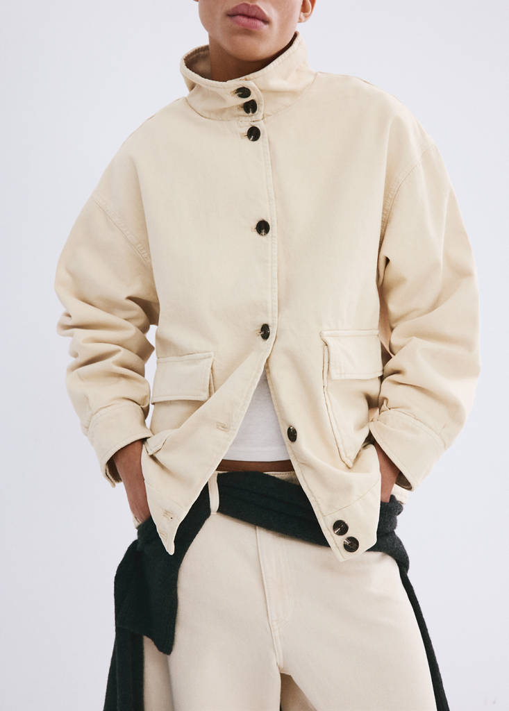 Tissu en coton style denim. Design oversize. Col montant. Manche longue. Poches plaquées et rabat. Fermeture avant avec boutons.