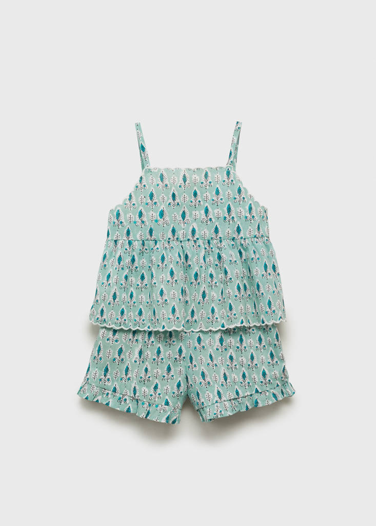 100% памучна материя. Щампован дизайн. Разкроен дизайн. Право деколте. Тънки презрамки. Бродирани детайли. Детайл с волани. Еластична талия. Без вътрешна подплата