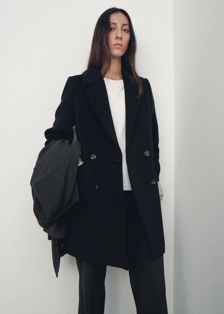 Смесена вълнена материя. Миди дизайн. Прав дизайн. V-образно деколте с ревер. Ревер с прорез. Дълги ръкави. Два странични джоба с капак. Двуредно закопчаване. Вътрешна подплата. Наличен Plus