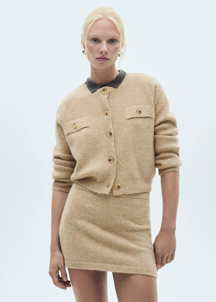 Смесена вълнена материя. Ребристо плетиво. Средна точка. Къса кройка. Прав дизайн. Кръгло деколте. Дълги ръкави. Закопчаване с копчета отпред. Два джоба с капаче и копче отпред. Total look