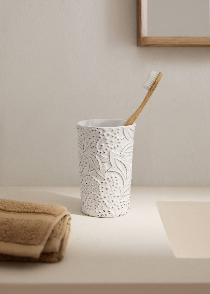 Чаша за баня. 100% керамика. Размер: 8x12 см. Релефен принт. Елегантен дизайн, който добавя нотка на изтънченост и дискретен лукс към вашата баня. Комбинирайте с още продукти от колекцията