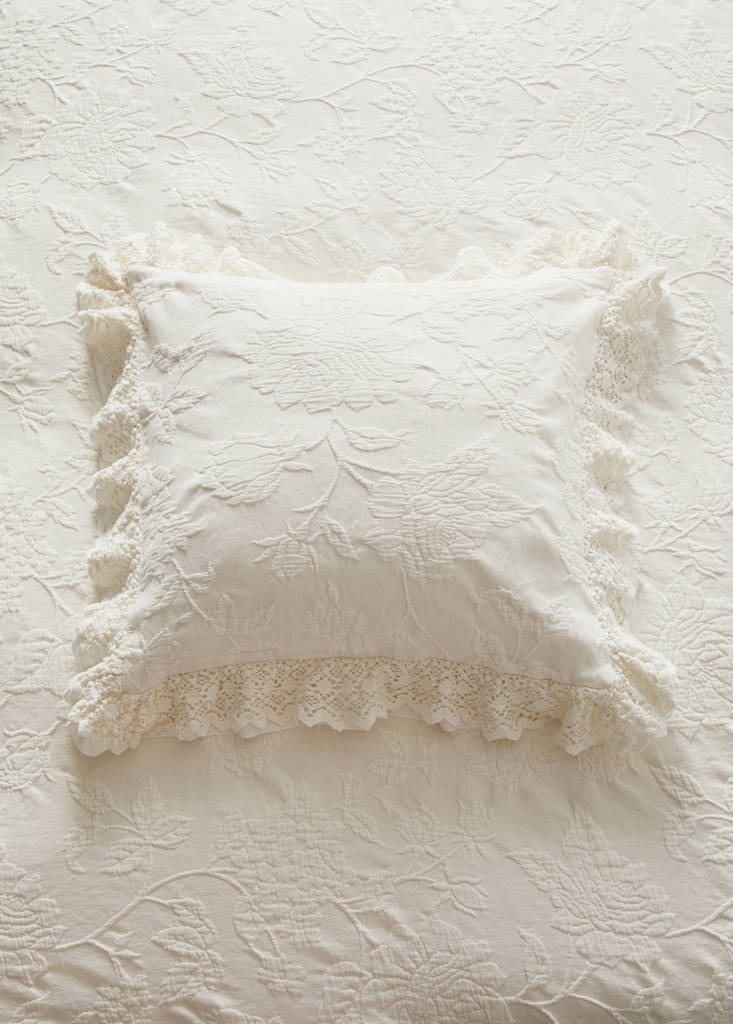 100% памук. Размер: 50x50см. Жакардова тъкан. Тюл с волан и дантела. Не включва пълнеж. Комбинирайте с още продукти от колекцията