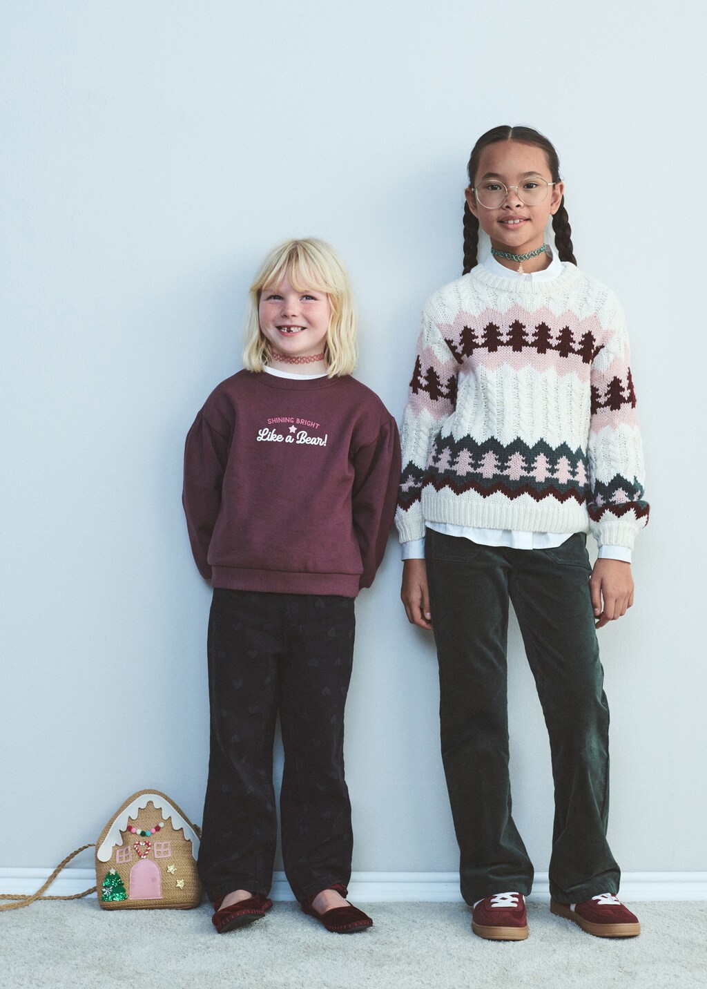 Knitted fabric. Christmas embroidered. Christmas tree. Round neck. Long sleeve. Ribbed collar, cuffs and hem. Christmas Collection.