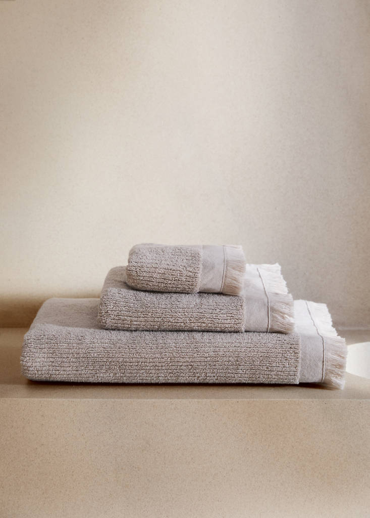 600 gr/m2Textured hand towel with fringesCurrent price [10.99 € лв. 21.49]10.99 €лв. 21.49Select a colourLight/Pastel GreySelect your size30x50cm (Face towel)50x90cm (Hand towel)90x150cm (Bath towel)SizeChoose your sizeAddAdd to your wishlistSee lookFree delivery to storeHand towel. Size: 50x90cm. 100% Cotton. 600 GSM. Fringed finish. Soft feel. Coordinates with more products from the collectionDetails, composition and careStore availability