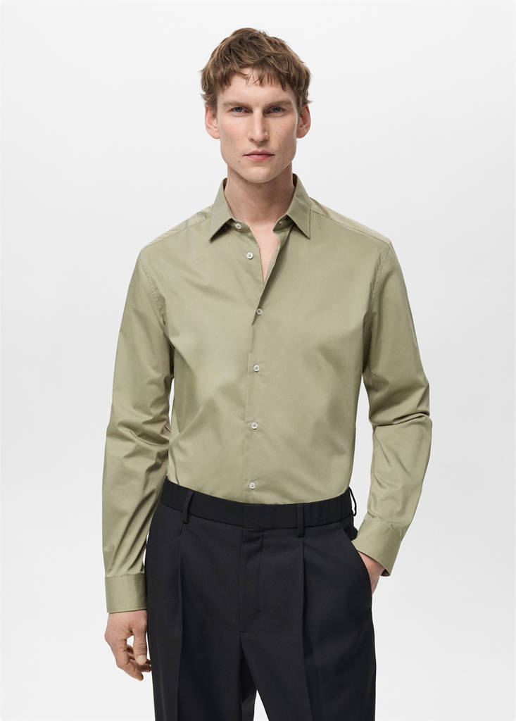 Regular fit. Slightly elastic cotton fabric. Classic collar. Front closure with buttons. Long sleeves with buttoned cuffs. Rounded base