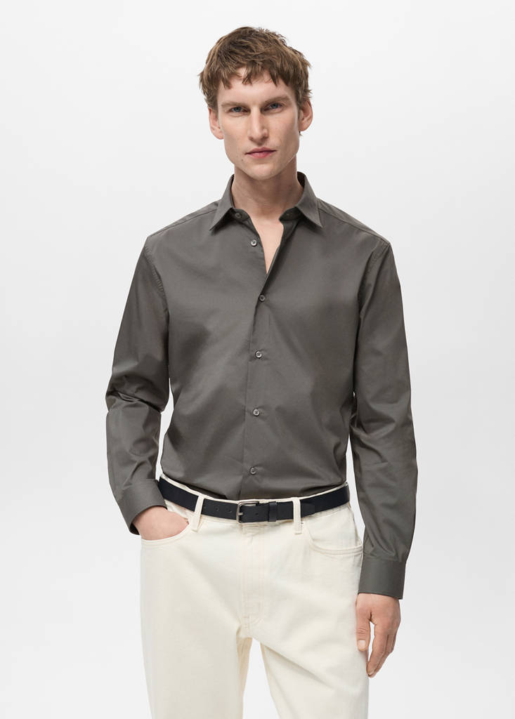 Regular fit. Slightly elastic cotton fabric. Classic collar. Front closure with buttons. Long sleeves with buttoned cuffs. Rounded base