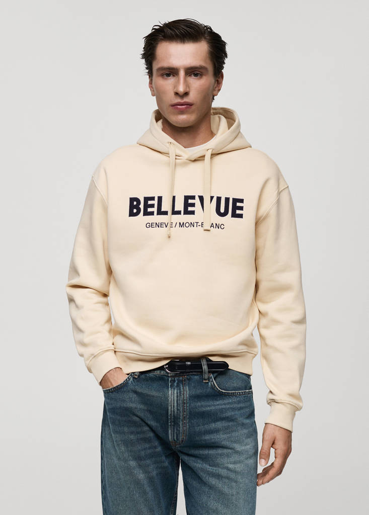 With hood. Printed text on the front. Cotton blend fabric