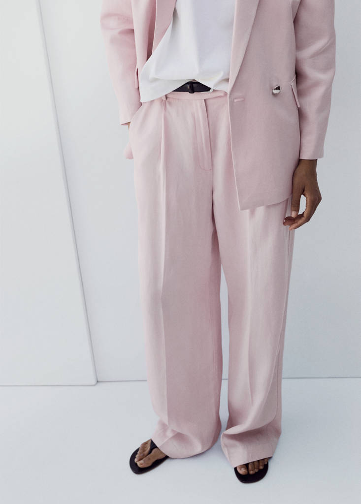 Linen mix. Straight design. Suit style. Low waist. Two side pockets. Belt loops. Two welt pockets at the back. Concealed button, hook and zip front closure with placket. Total look. This garment is part of our party and event collection, designed to elevate your looks for special occasions