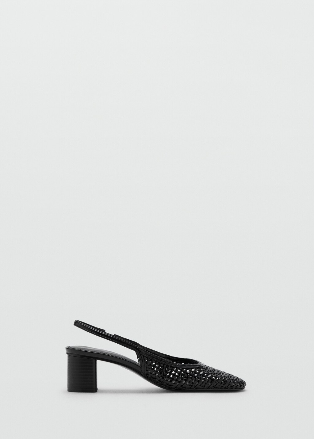 مقدمة القدم مدورة. تصميم مفتوح من الخلف. تصميم مُضفر. كعب سميك. كعب 6.5 سم. إغلاق بشريط.