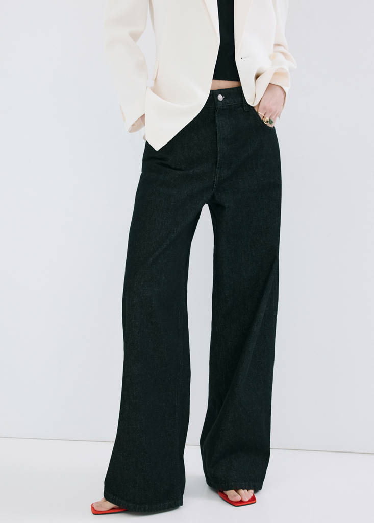 قماش قطني بأسلوب جينز. تصميم بالون. خصر عالي. حلقات حزام. خمسة جيوب. جيب على الجانب. زر وسحاب للإغلاق