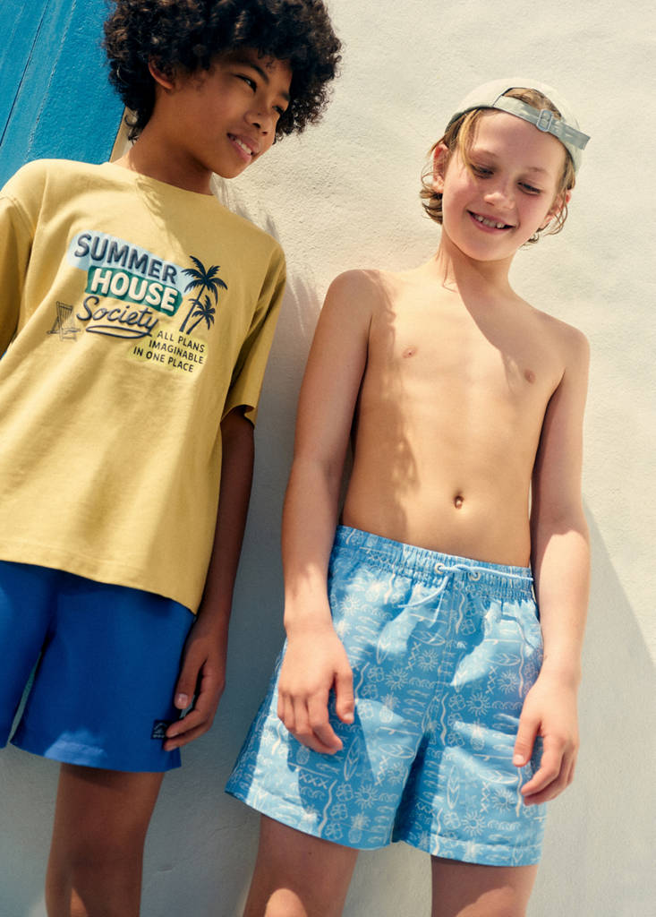 نسيج مطاطي. تصميم مستقيم. تصميم قصير. تصميم مطبوع. خصر مطاطي بحبل قابل للتعديل. حبل بلون متباين. جيبان جانبيان. مجموعة الحمام