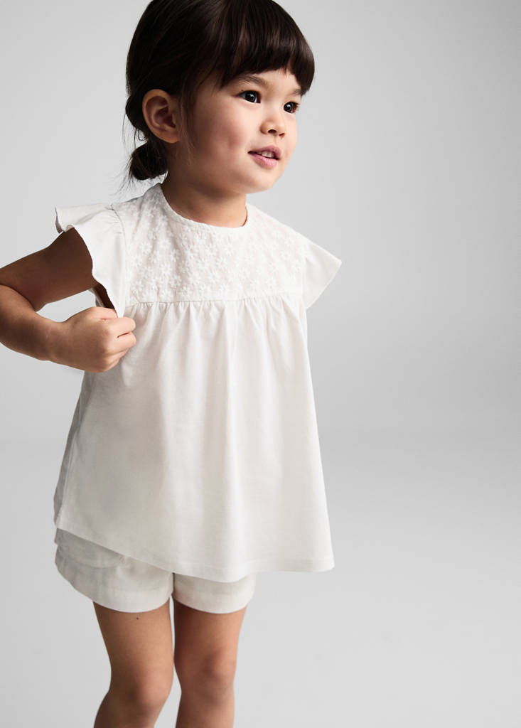100% قطن. تطريز زهور. ياقة دائرية. كشكشة عند الأكمام. أكمام قصيرة. إغلاق بزر