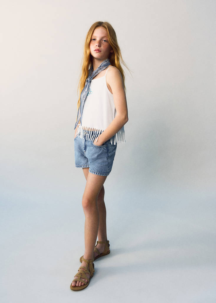 نسيج 100% قطن. تصميم مستقيم. تصميم قصير. حلقات للحزام. خمسة جيوب. إغلاق بسحاب وزر. تفاصيل النجوم المطرزة على الجزء الخلفي. تفاصيل زينة على شكل لؤلؤ