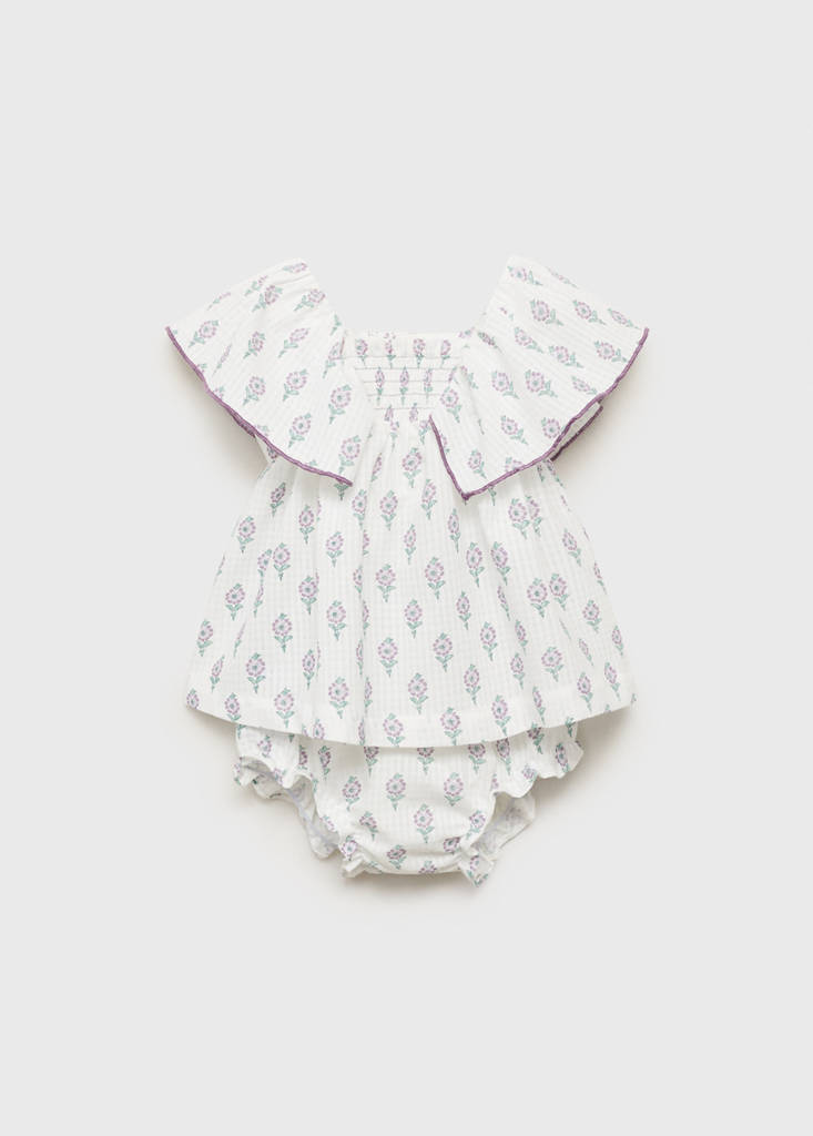 نسيج 100% قطن. تصميم مطبوع. تصميم إيفازي. نقش زهري. إغلاق أمامي بأزرار. ياقة بابيدول. رانيتا نهايات مرنة