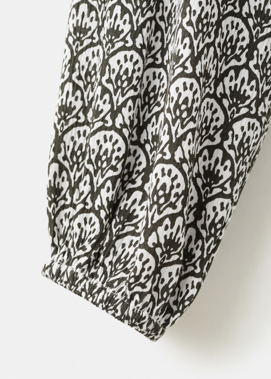 نسيج انسيابي. تصميم مطبوع. ياقة على شكل حرف V. أكمام طويلة بحواف مضلعة. حاشية بتموجات متقاربة قابلة للتعديل. قوس عند الحاشية.