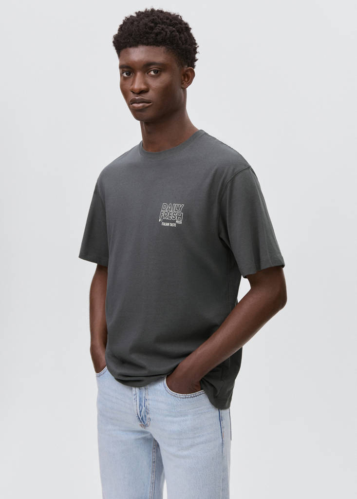 نسيج 100% قطن. تصميم قصير. تصميم مطبوع. ياقة دائرية. أكمام قصيرة. نص مطبوع في الأمام. رسم بيتزا على الجزء الخلفي