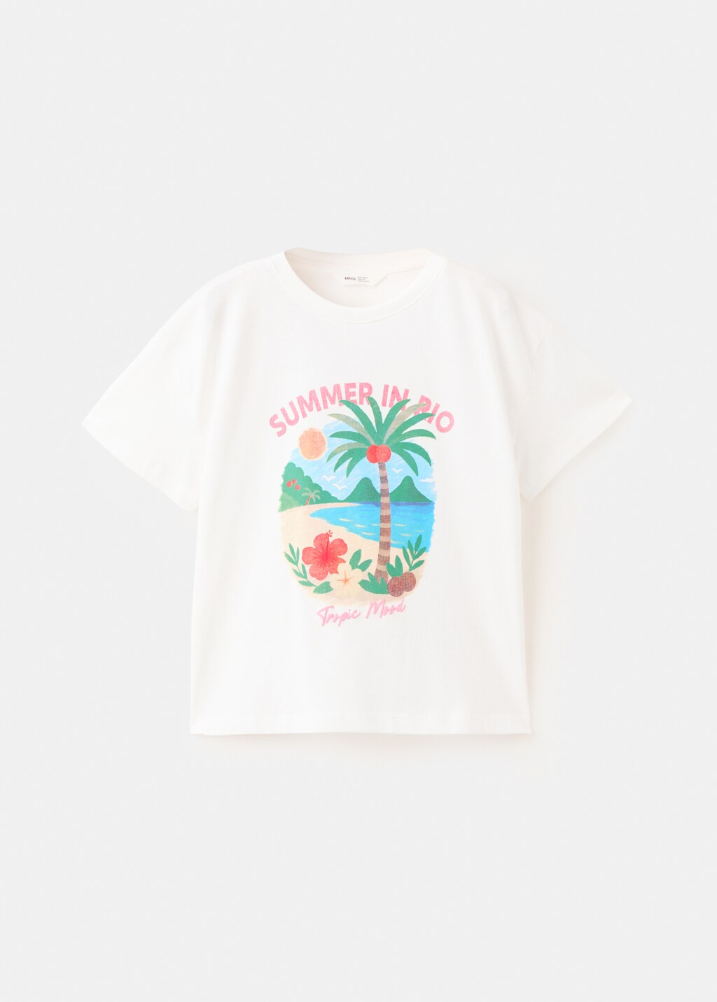 100% cotton fabric. Straight design. Round neck. Short sleeves. Printed drawing on the chest. Tropical print design