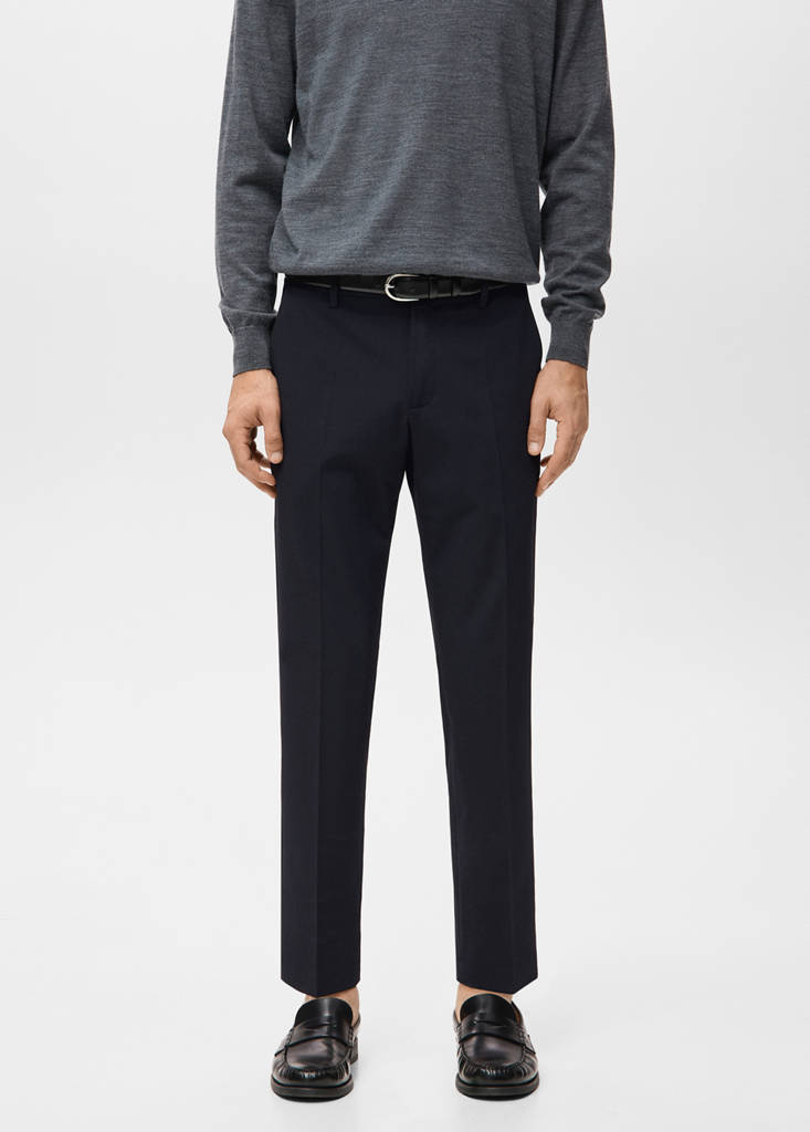 Super slim fit. Chinos style. Cotton elastic. Belt loops. Two side pockets. Coin pocket. Two welt pockets at the back. Zip and button fastening