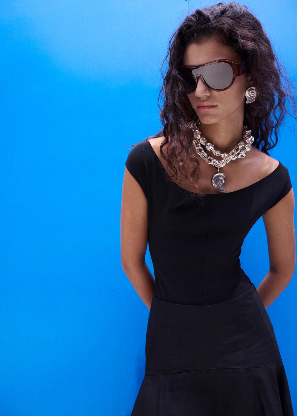 Stretch fabric. Fitted design. Boat neckline. Sleeveless. Wide straps. Open back. No Fastening. Selection Collection