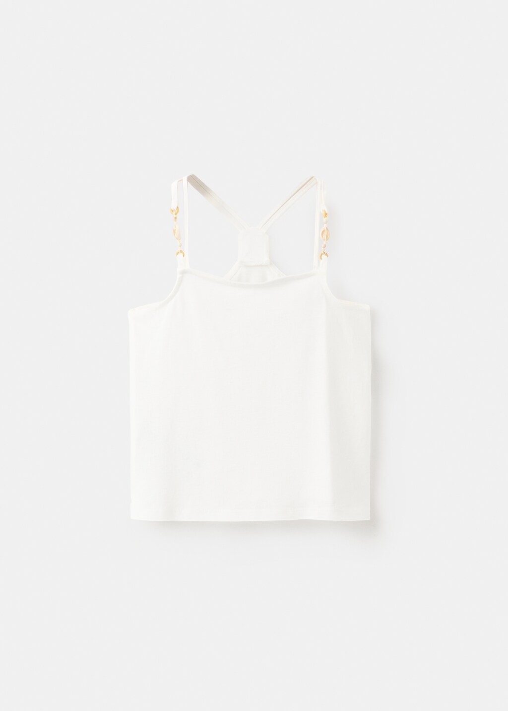 100% cotton fabric. Straight design. Straight collar. Straps. Shell embellishment on the straps