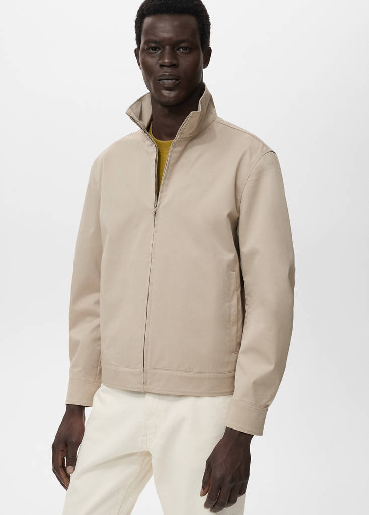 Cotton blend fabric. Straight Silhouette. Neck lapel Funnel neck. Two side welt pockets. Long sleeves. Buttoned cuffs. Front zip closure. Adjustable hem with button