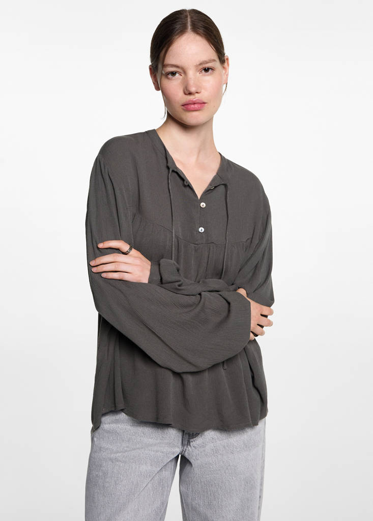 Fluid fabric. Oversized design. Long puffed sleeves. Buttoned cuffs. Round neck. Tie fastening. Three-button front closure. The model is 175cm and is wearing a size M. Back to class