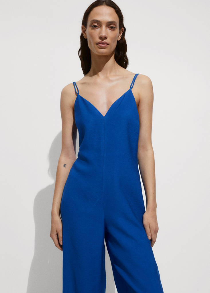 Fluid fabric. Straight design. Long design. V-neckline. Sleeveless. Double thin straps. Invisible back zip fastening. Lightweight fabric. Back closure. Ankle brace. V-neck. Thin straps. Without inner lining