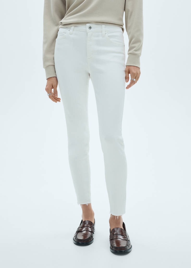 Denim-style cotton fabric. Stretch fabric. Skinny fit. Crop design. Mid-rise. Belt loops. Five pockets. Zip and button fastening. Frayed finish. Inseam 68 cm. Available Plus