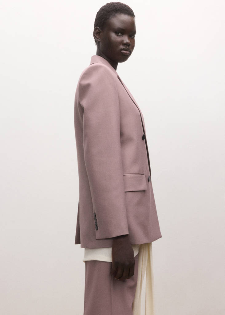Tissu de laine mélangé. Style costume. Coupe droite. Col en V avec rabat. Revers à encoche. Manches longues et poignets boutonnés. Poche passepoilée sur la poitrine. Deux poches à rabat sur les côtés. Fermeture à double boutonnage. Doublure intérieure. Total look. Collection Selection