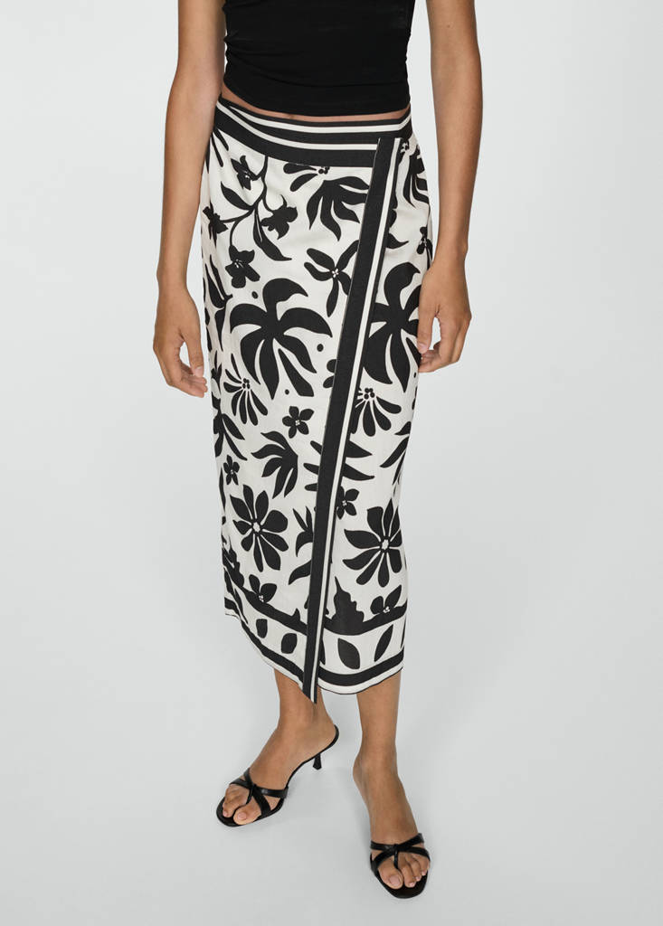 Tissu fluide. Taille haute. Coupe midi. Coupe droite. Coupe croisée. Imprimé floral. Fermoir clip métallique
