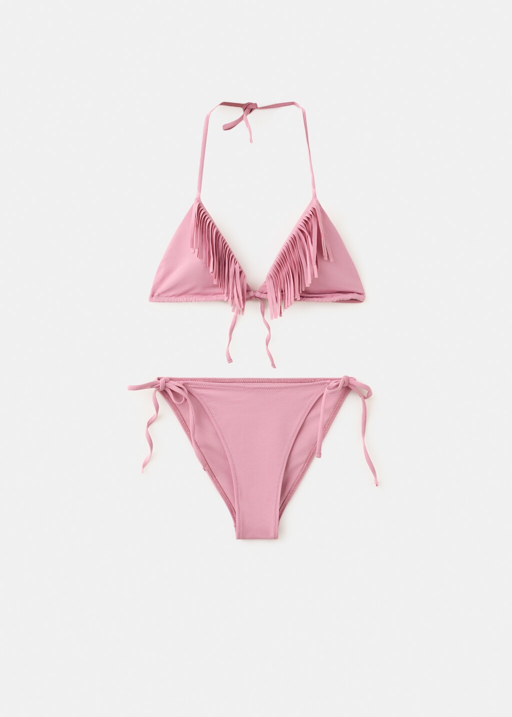 Pack de bikini. Tissu élastique. Design triangulaire. Lien à nouer autour du cou. Détail de nœuds à la taille. Détail nœuds réglables. Empiècement à franges. Culotte taille moyenne.