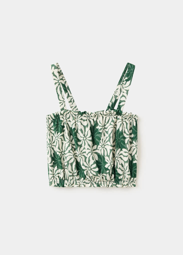 Straight design. Floral-print design. Straight collar. Straps. Elastic hem