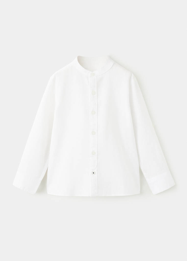 Cotton and linen blend fabric. Stand-up collar. Long sleeves with buttoned cuffs. Front closure with buttons