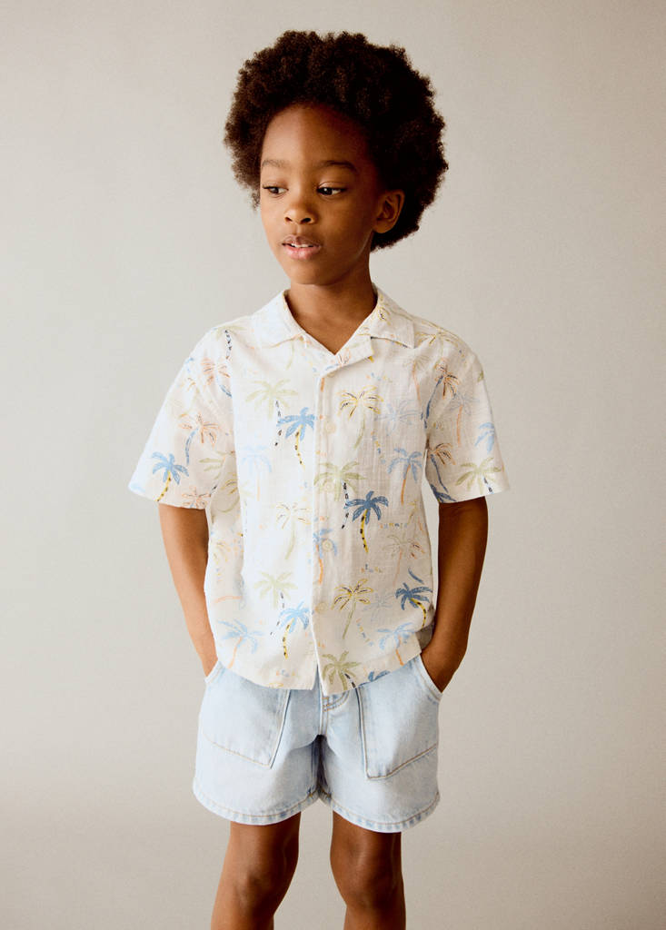 Crafted from 100% cotton fabric, this garment features a straight design with a shirt collar and short sleeves. The front button fastening complements its palm tree print.