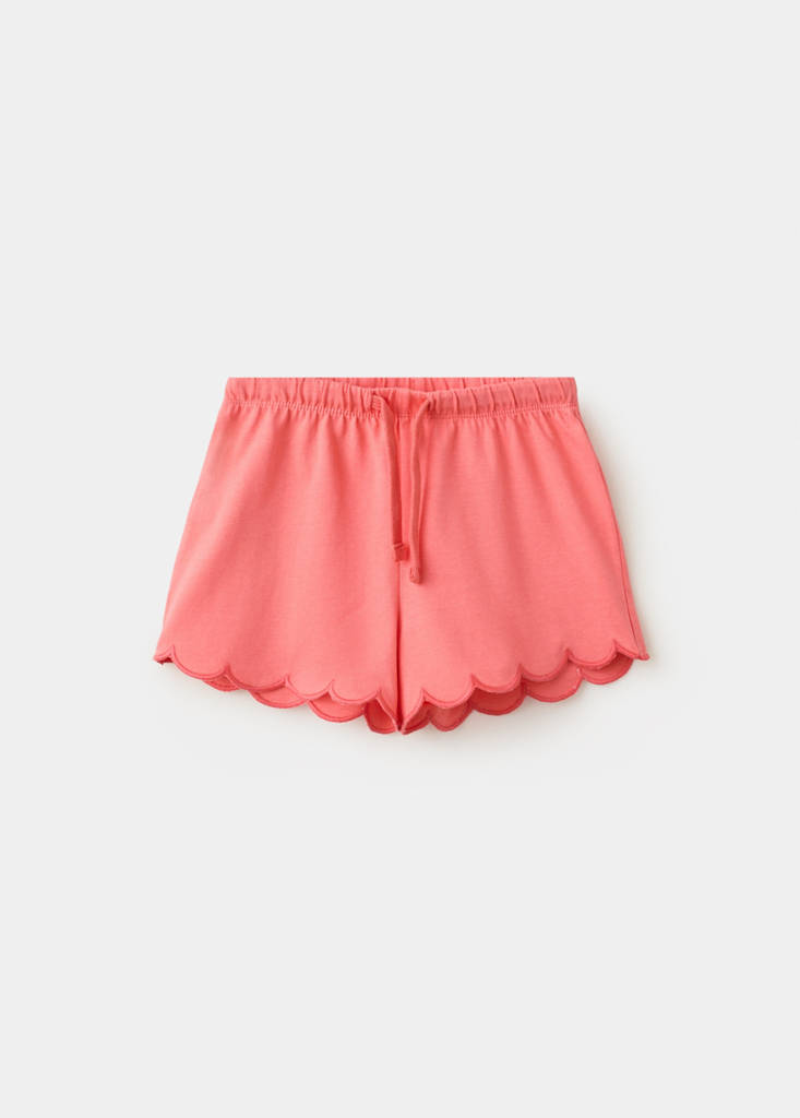 100% cotton fabric. Straight design. Short design. Elastic waist with adjustable drawstring. Scalloped details