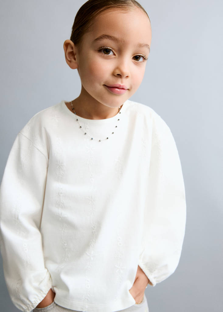Crafted from 100% cotton fabric, this garment features a straight design with a round neckline. The long sleeves have elasticated cuffs and embroidered details. The teardrop fastening at the back completes the design.