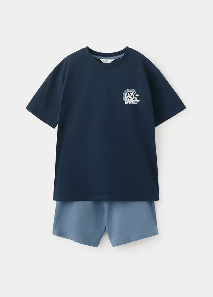 100% cotton fabric. Straight design. Short design. Round neck. Short sleeves. Printed drawing on the chest. Printed drawing on the back. Elastic waist. Contrasting colours