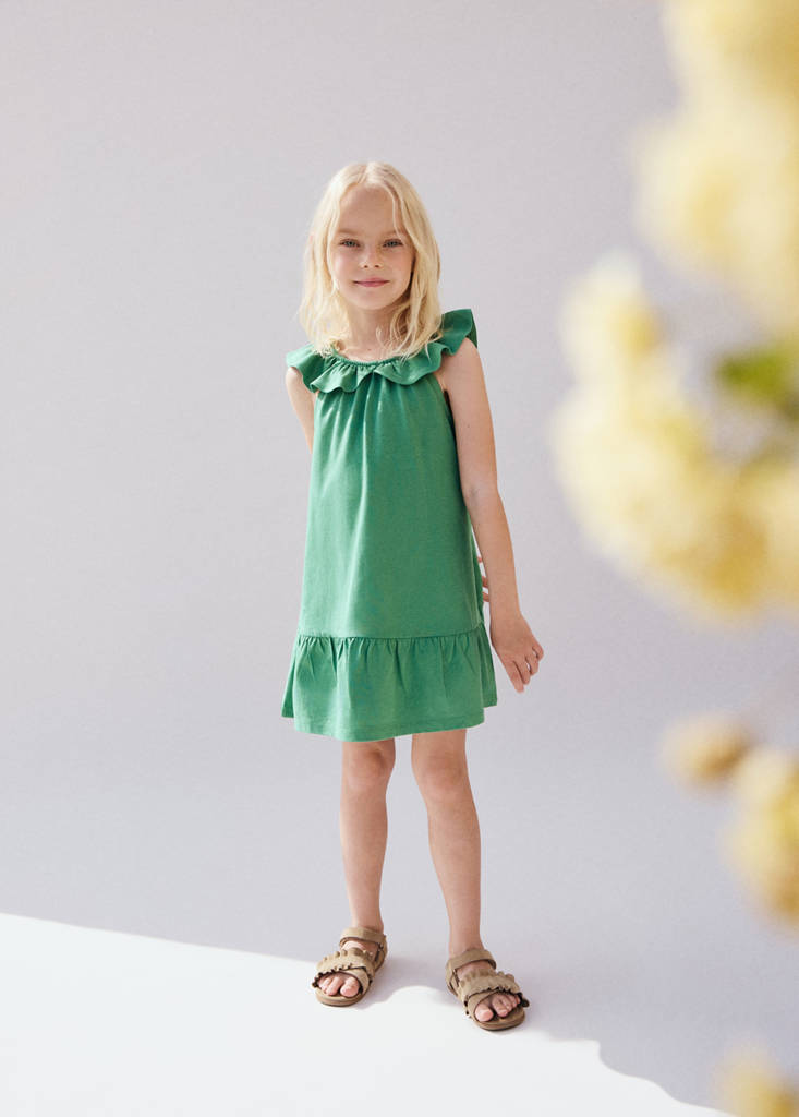 Frill cotton dressCurrent price [US$ 25.99 ]US$ 25.99Select a colourPastel GreenSelect your size12-18 months (86cm)18-24 months (92cm)2-3 years (98cm)3-4 years (104cm)4-5 years (110cm)5-6 years (116cm)MeasurementsAddAdd to your wishlistSee lookFree delivery to store100% cotton fabric. Straight design. Short design. Round neck. Sleeveless. Ruffles detail on the neckDetails, composition and careStore availabilityItem qualitiesRecycled cottonAt least 20%This fibre is obtained from pre- and post-consumer textile waste that is transformed into new fabrics.