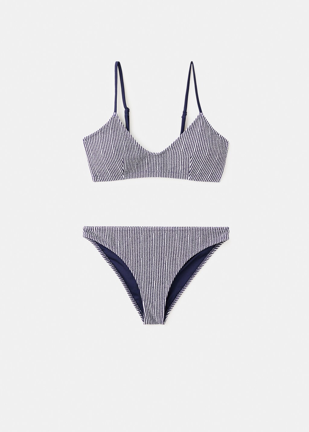 Bikini set. Stretch fabric. Stripe design. Textured fabric. Round neck. Thin straps. Detachable filling. Classic panty.