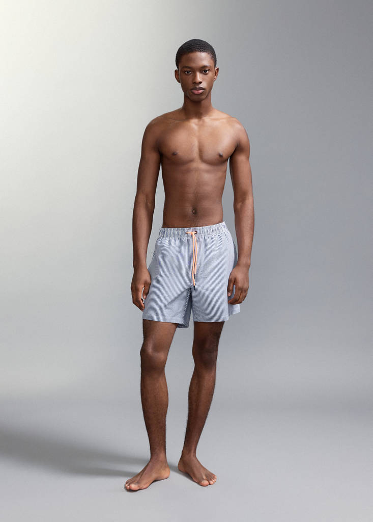 Straight design. Short design. Striped design. Elastic waist with drawstring. Back pocket. Swimwear collection