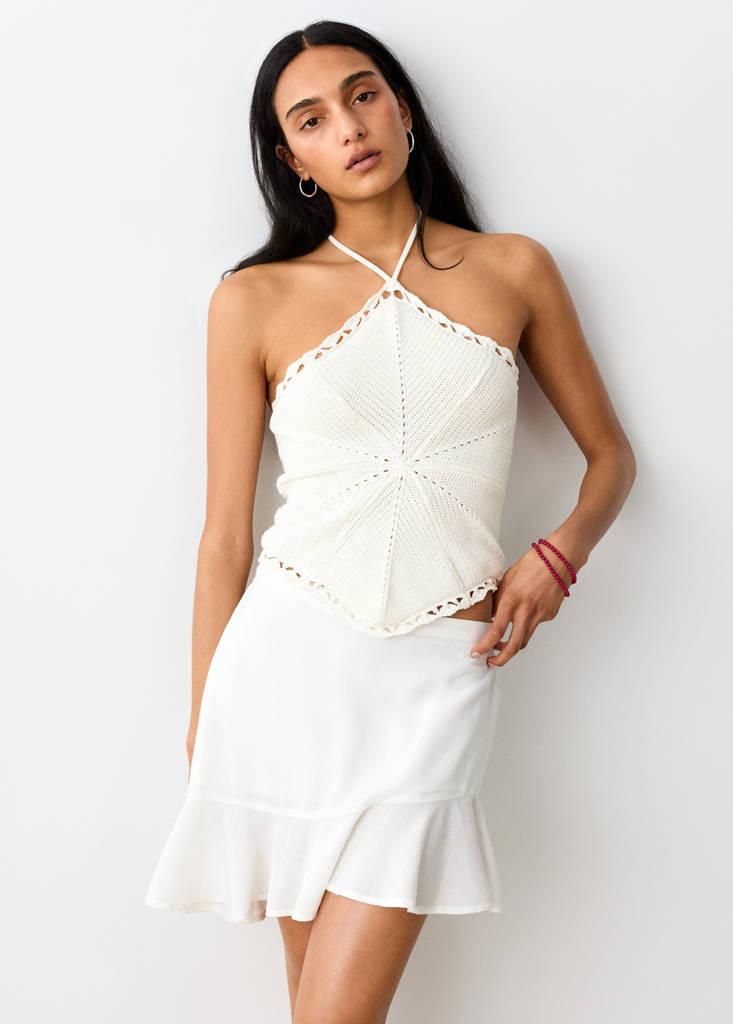 Crochet openwork halter topCurrent price [US$ 39.99 ]US$ 39.99Select a colourWhiteSize change - Consult the Size GuideSelect your sizeXXSXSSMLMeasurementsAddAdd to your wishlistSee lookFree delivery to store100% cotton fabric. Open-knit fabric. Halter neck. Sleeveless. Bow fastening on the neck. Cut-out embroidered detailsDetails, composition and careStore availabilityItem qualitiesRecycled cottonAt least 20%This fibre is obtained from pre- and post-consumer textile waste that is transformed into new fabrics.