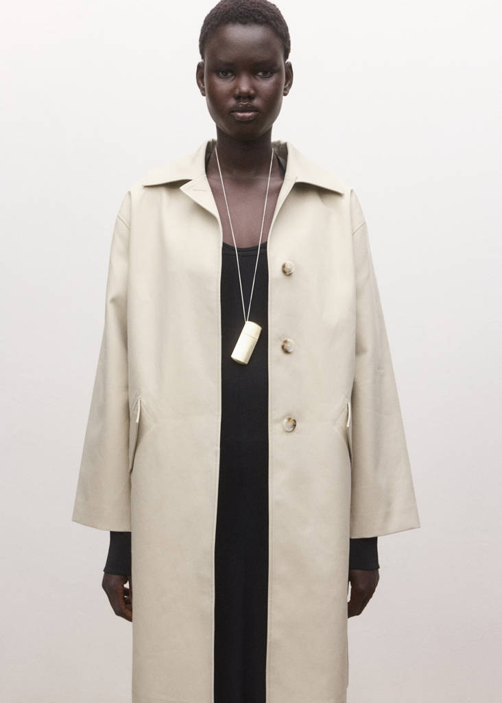 100% Cotton. Straight design. Long design. Long sleeves. Shirt collar. Concealed front button fastening. Two side pockets with flaps. Lining only. Selection Collection