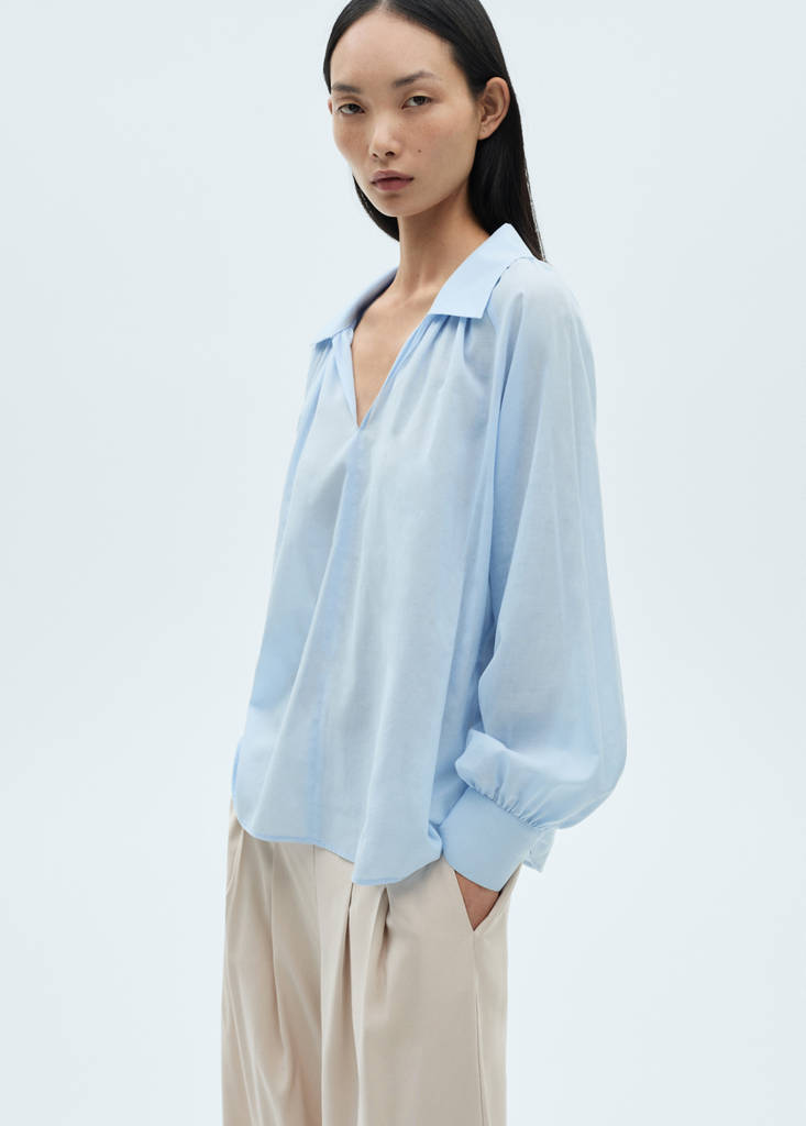 Tejido ligero. Tejido fluido. Diseño recto. Diseño semitransparente. Cuello camisero. Escote de pico. Manga larga abullonada. Manga larga con puños abotonados. Cierre delantero. Diseño estándar. Manga larga