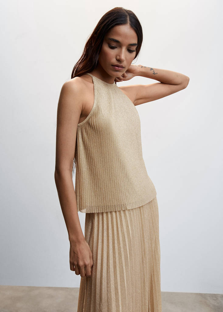 Tejido de lúrex. Diseño recto. Tirantes finos. Cuello redondo. Sin mangas. Forro interior. Cierre de botón en el cuello. Total look. Colección fiesta y ceremonia