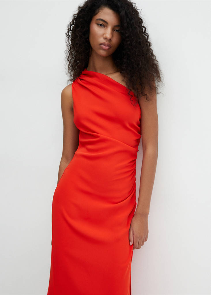 Tejido fluido. Diseño largo. Diseño asimétrico. Tirante ancho. Hombro descubierto. Cierre cremallera invisible en el lateral. Abertura latera en el bajo. Detalle fruncido. Colección fiesta, ceremonia y comunión. Diseño entallado