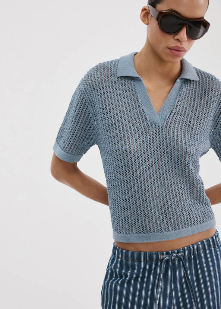 Средняя вязка. Ажурная вышивка. Прямой крой. Воротник поло. Короткий рукав. Без застёжки.