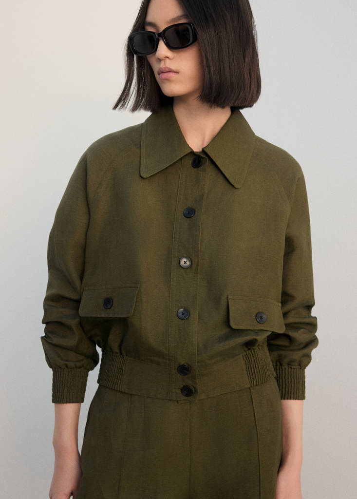 Ткань из смеси льна. Прямой крой. Рубашечный воротник. Длинные рукава с эластичными манжетами. По бокам два накладных кармана с клапанами. Передняя застежка на пуговицы. Total look.