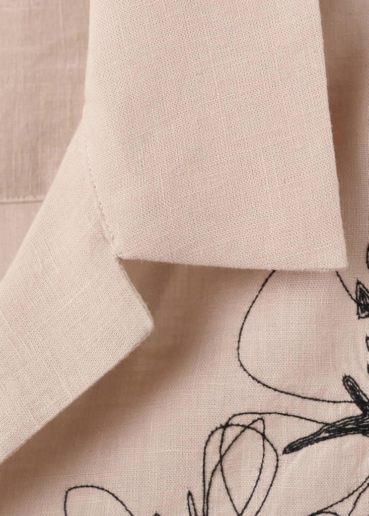 Прямой крой. Ткань из смеси льна. Цветочный принт. Воротник в стиле боулинг. Короткий рукав. Передняя застежка на пуговицы.