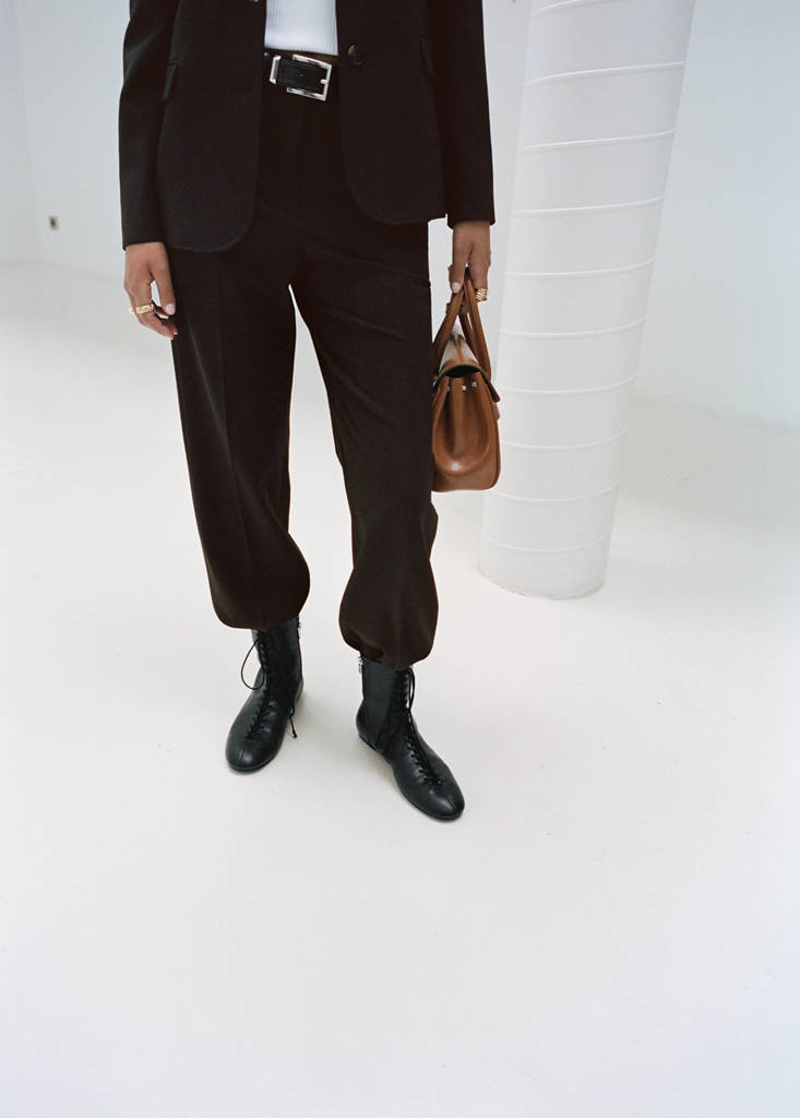 100% bovine leather. Flat. Round toe. Drawstring and zip closure. Inner lining. Online Exclusive