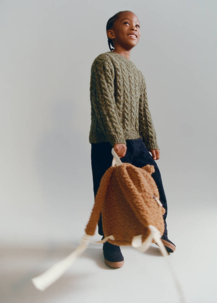 Tejido mezcla de algodón y lana. Diseño recto. Diseño trenzado. Cuello redondo. Manga larga. Acabado en canalé. Cierre de botón en la parte posterior